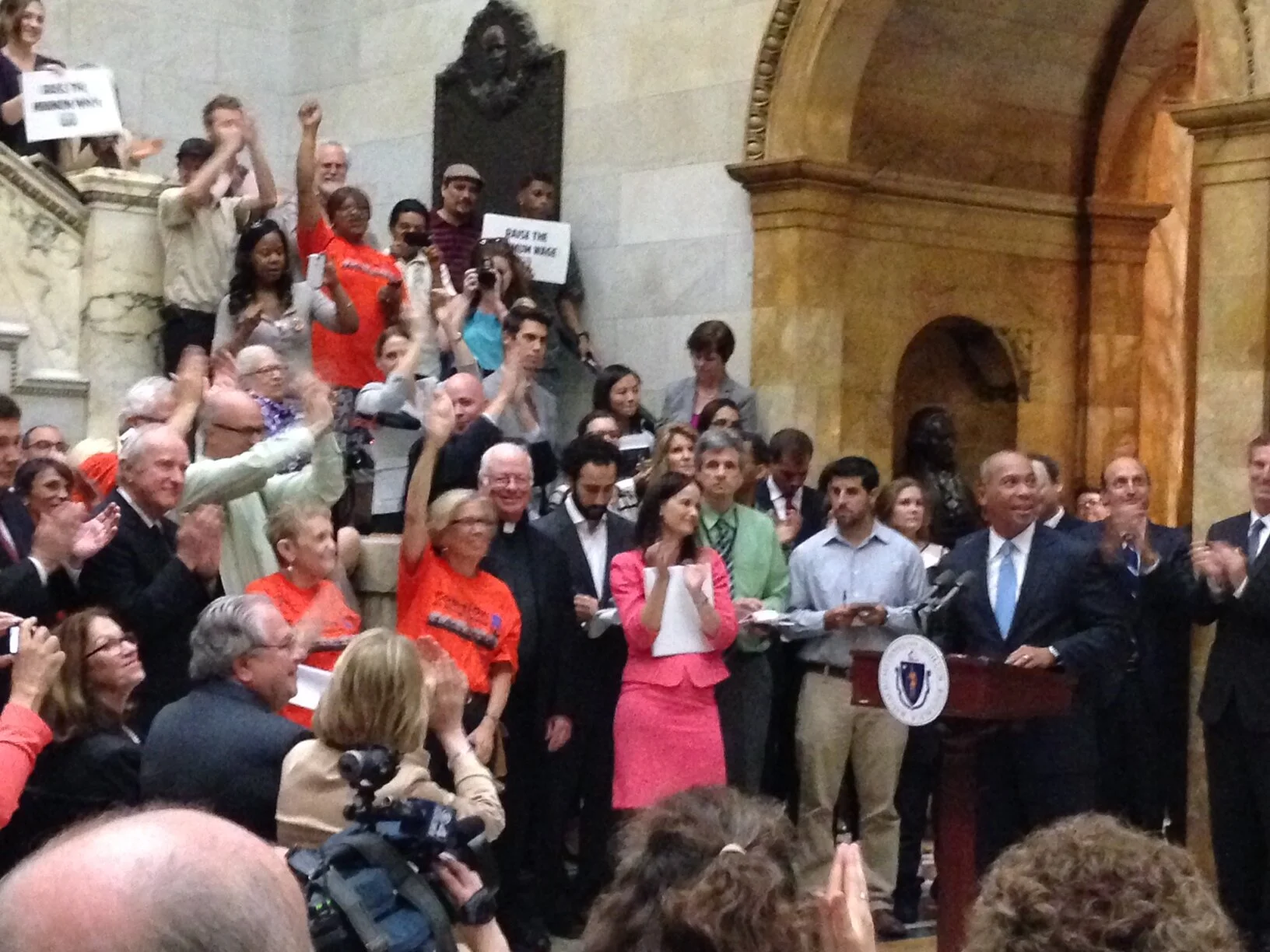 The NE JLC has been a member of the Raise-Up Massachusetts Coalition that works to improve working conditions for low-income workers. The NE JLC collected signatures for two ballot initiatives: The first was to increase the minimum wage and to establish earned sick days. NE JLC successfully organized synagogues to collect signatures. The minimum wage bill will not go to ballot because Raise Up Massachusetts pressured the legislature to pass a minimum wage bill. The minimum wage will be raised from $8.00 to $11.00 in the next two and a half years. The bill was sign into law on June 26, 2014.The JLC continued to be an active member of Raise Up Massachusetts as the coalition fought for $15 minimum wage and Paid Family & Medical Leave, which were adopted into law during the summer of 2018. Check out our page on Raise Up for more info about this win!